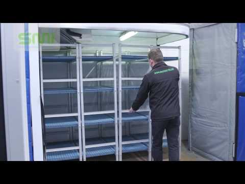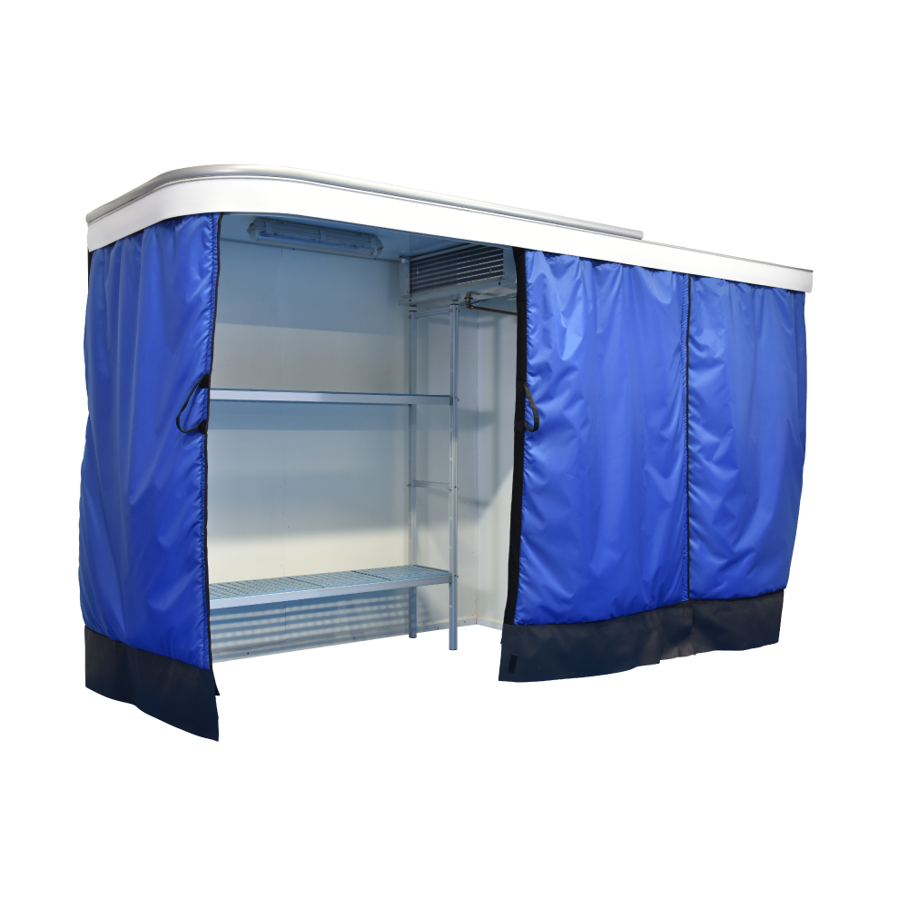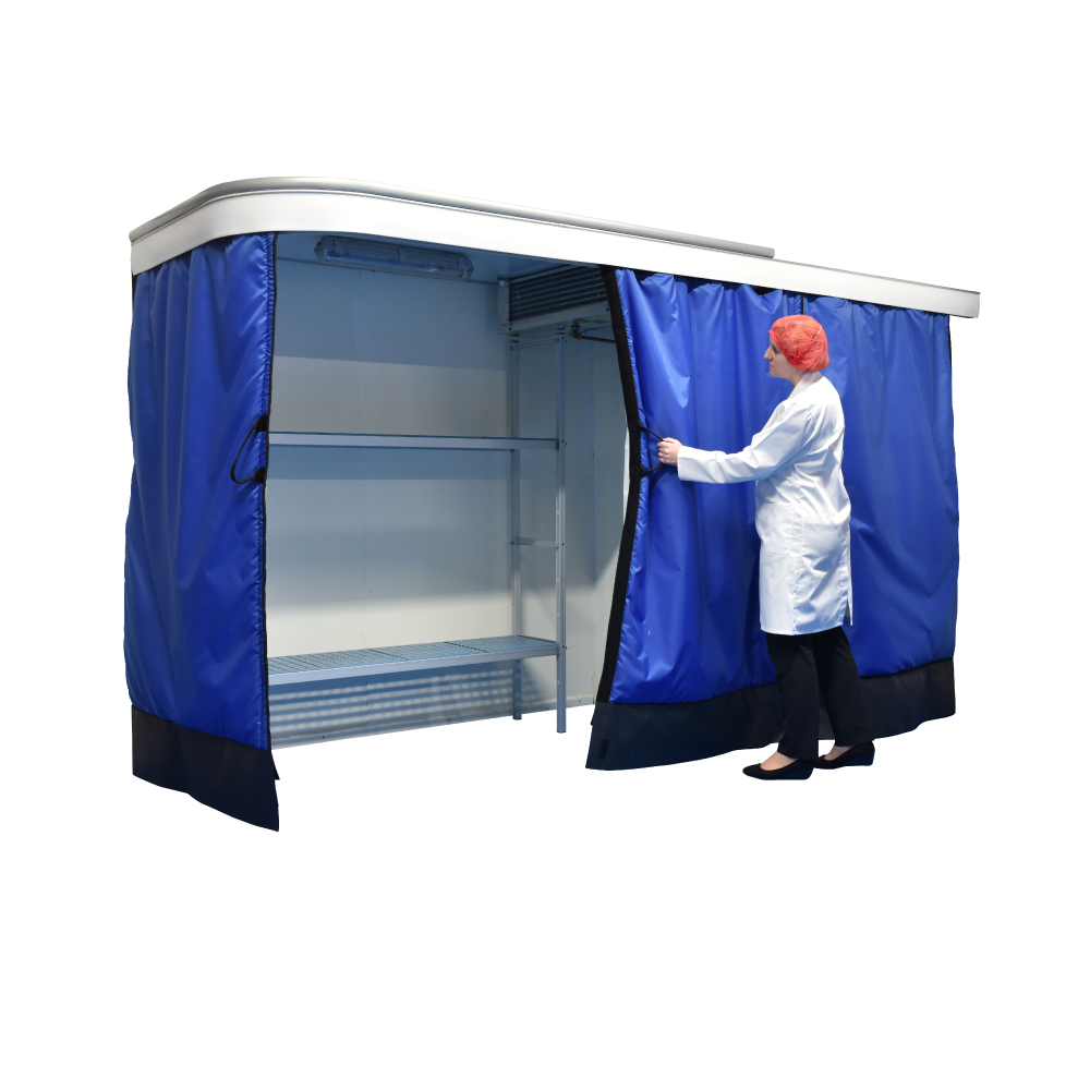 The Cold-Korner™ is simply constructed from a pre-made thermal roof panel which is suspended from a ceiling or wall, often in a corner, Tempro® curtains are fitted on to SMI’s unique track to provide nearly 6 to 7 cubic metres of chilled space which is then chilled by a well tried and tested evaporator designed for the purpose and runs from a 13 amp single phase supply.