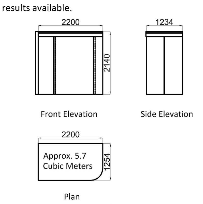 Standard dimensions are 1200mm deep by 2200mm long by 2100mm high.